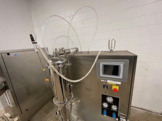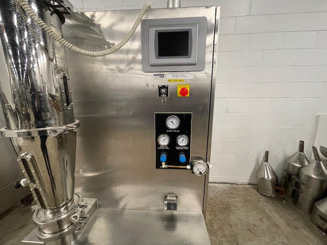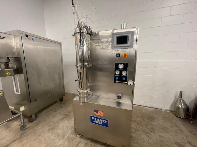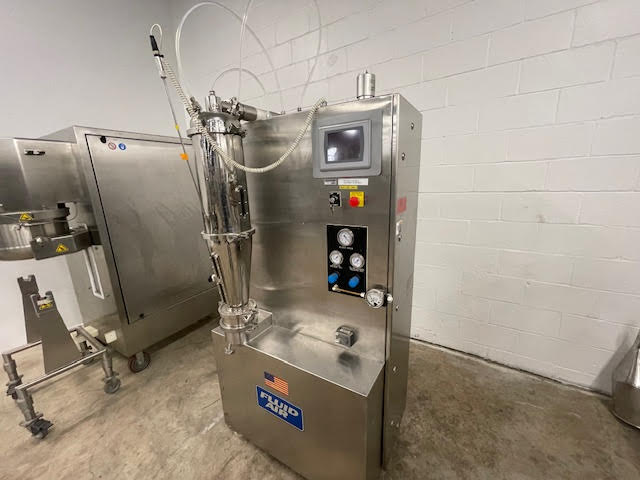 Fluid Air lab fluid bed dryer, model 0002, stainless steel and glass construction, with 2 liter bowl, with peristaltic feed pump and plc controls, 208/230/ volt, single phase