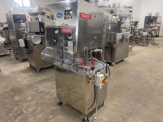 King CF100 Cottoner. Unit is constructed of Stainless Steel and can do up to 100 bottles per minute. Comes with control panel, plexiglass guarding and is mounted to a Stainless Steel enclosed frame. Containers Dimensions: 25mm to 75 mm diameter, 18mm to 200mm height, 10mm to 50mm neck size. Length of cotton is adjustable for different size bottles. Electrics: 3 Ph/60 Hz/220 volts