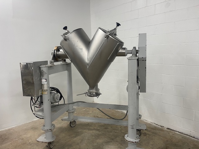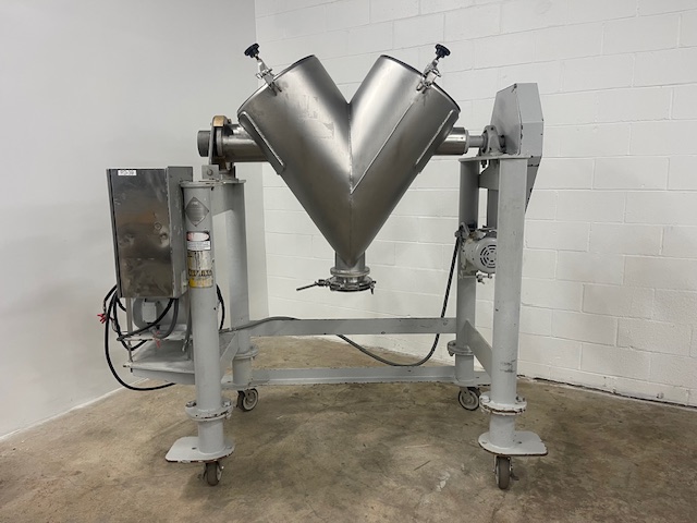 Patterson Kelley 5 Cu. Ft. Stainless Steel Twin Shell V Blender Last used in food production, blender is rated 62 LBS/Cu. Ft. maximum density. Equipped with control panel, blender is on stand and is equipped with approximately 6 In. diameter hand-operated “butterfly” discharge valve