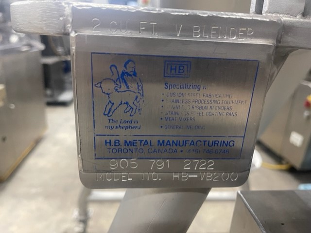 2 CUFT Twin Shell Dry V Blender, S/S VOLT 230/460/3 .HP 0.25 , stainless steel, blender controls On casters for portability, blender has top covers, as well as hand operated butterfly discharge valve.