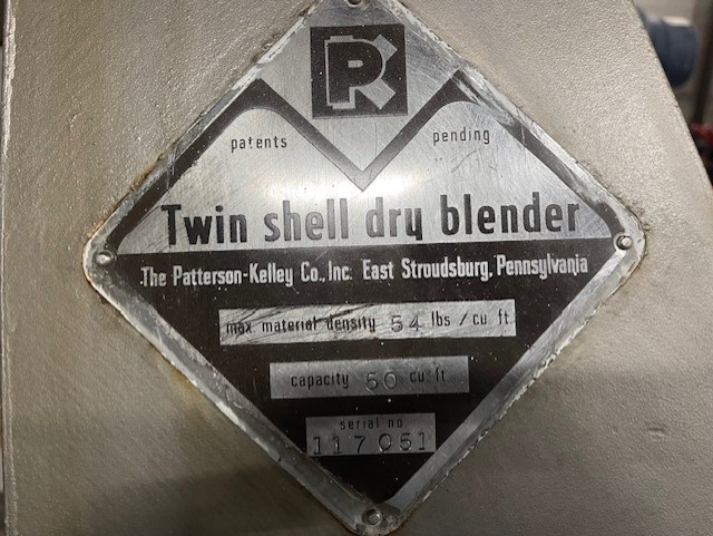 Patterson Kelley Twin Shell Dry Blender, 50 Cubic Feet Capacity, 304 Stainless Steel. (2) 18" Diameter charge. Driven by an approximate 5 hp, 3/60/230/460 volt, 1725 rpm, L : 150" , H : 184" , W : 76" , Discharge High : 90".