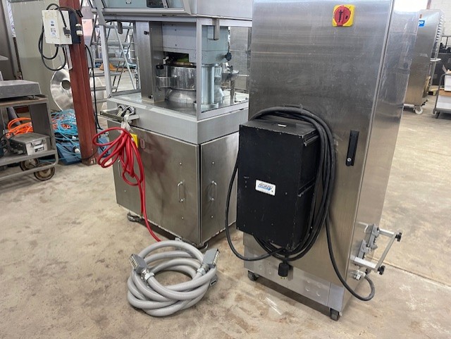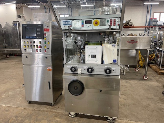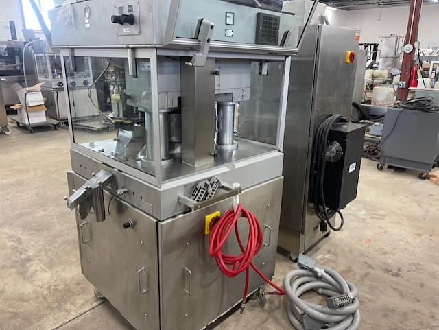 IPR Unipress TCS Tablet Press The Manesty Unipress tablet press is a single sided tablet press with pre compression that provides flexibility with its quick changeover for Research & Development, Scale-up, and Small to Medium Batch Sizes. Hours of operation: 3100,67. Max pression: 50 kgN. PLC machine control. Two Paddle Rotary Feeder Assembly. Pressure rolls with sealed bearings. Guard Doors with Safety Interlocks. Hydraulic Overload System. Includes manuals. ** Please note - All sales of tabletting and encapsulation equipment will be registered in accordance to D.E.A. guidelines. **