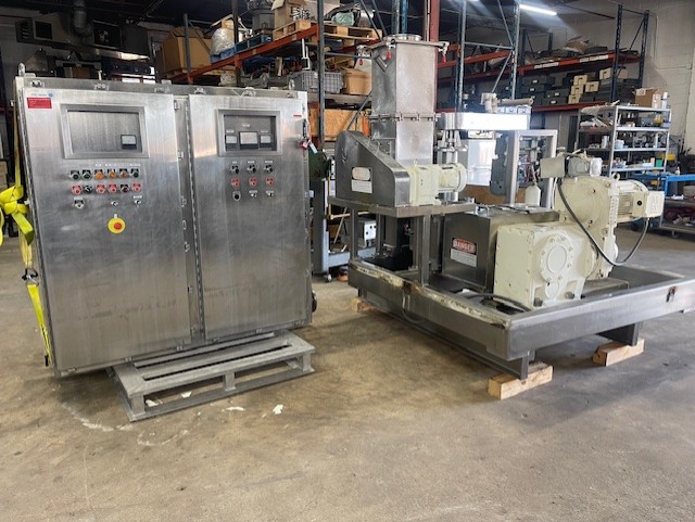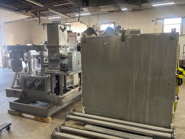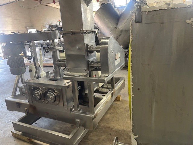 | Description | : | Fitzpatrick Model 4LX10D, 316 stainless steel, free standing roller compactor, chilsonator with onboard stainless steel Fitzmill Model DKASO12 knife rotor hammer mill and the system is rated from 250 – 400 kg of product per hour – depending on materials, application, machine configuration and environment being run in. Equipped with 4" OD horizontal metering screw with 1 Hp motor drive that eliminates vacuum dearation to 4 OD" vertical pre-compression screw with 5 Hp motor drive, that compresses product for more uniformity prior to feeding into the 4" OD x 10" long face cored product compaction rollers with 7.5 Hp motor drive and bulk densities of feed from 10 to 100 lbs per cubic foot and roll force of 17.5 KN/cm with roll gap range of 1mm to 6mm.horizontal screws, variable frequency speed controls with start and stop push buttons and e-stop. Mounted on (4) stainless steel legs. |