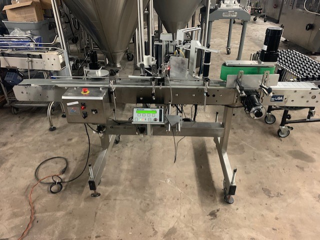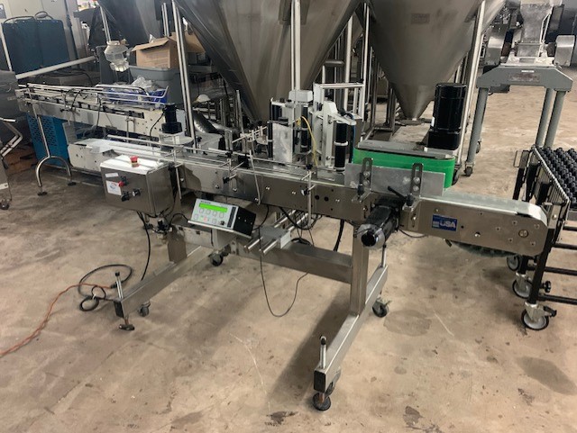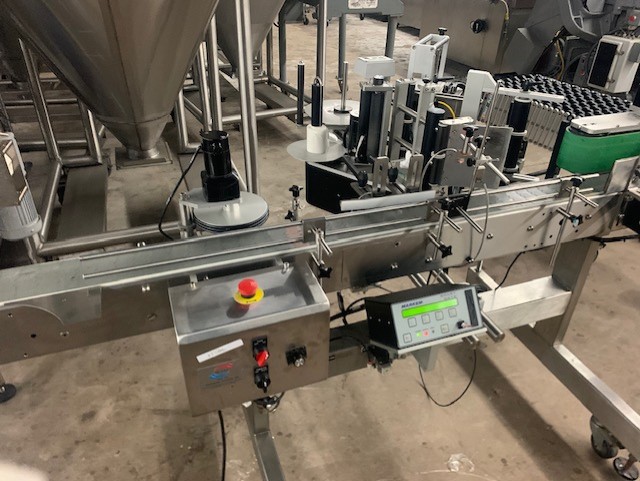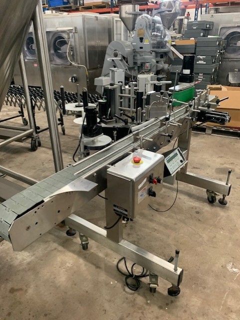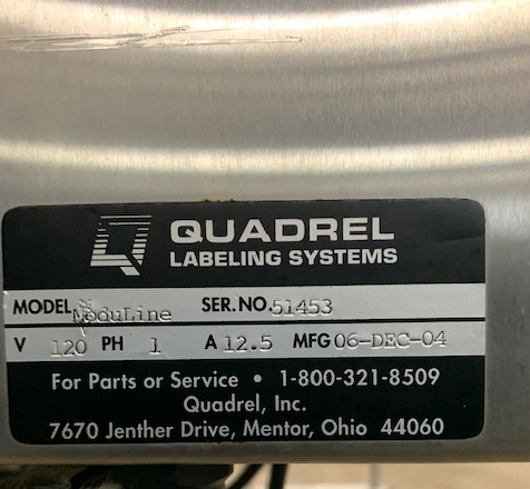 Quadrel Moduline automatic Pressure Sensitive Bottle Labele. 4.5” x 8’ Stainless Powered Conveyor Product Photo Eye detection Speed Controls Stainless Adjustable Side Rails Casters E-Stop Electrical 110 Volt / 50/60 HZ / 1 Phase Overall Dimensions 100” Long x 88” Wide x 80” High