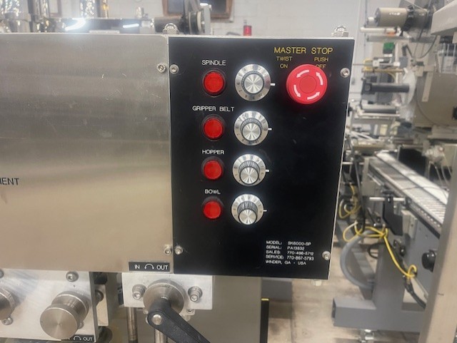 SureKap SK6000-SP Capper with Vibratory Feeder, cap sizes (approx. 15mm to 76mm) - Right to Left Container Flow - 24“ Diameter Vibratory Cap Sorter - Vibratory Cap Hopper Feeder (approx. 4 cubic feet) - Dual Container Stability Gripper Belts - Manual Height Adjustment - Electrical 110 Volt, 1 Ph, 60 Hz.